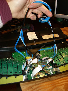 I added extensions to the 3 connections to the pcbs on one side. For the 2 that use flat flexible cable, Kinesis was awesome enough to send me some extra flat cable and the sockets so I built standalone extenders with a socket on each end and then connected them to the pcbs on either end using the short FFC cables. You can see this in the foreground. For the thumb buttons, I cut the jumper ribbon cable and soldered my extension cables straight to both sides. I used little pieces of insulation from thicker cable as sleeves that I covered the solder junctions with. Those are the yellow thing you see. I used heat shrink tubing to bundle the wires together. I mostly used very thin wire (don't know the gauge) but ran out before I was quite done so I used a bit of ribbon cable.